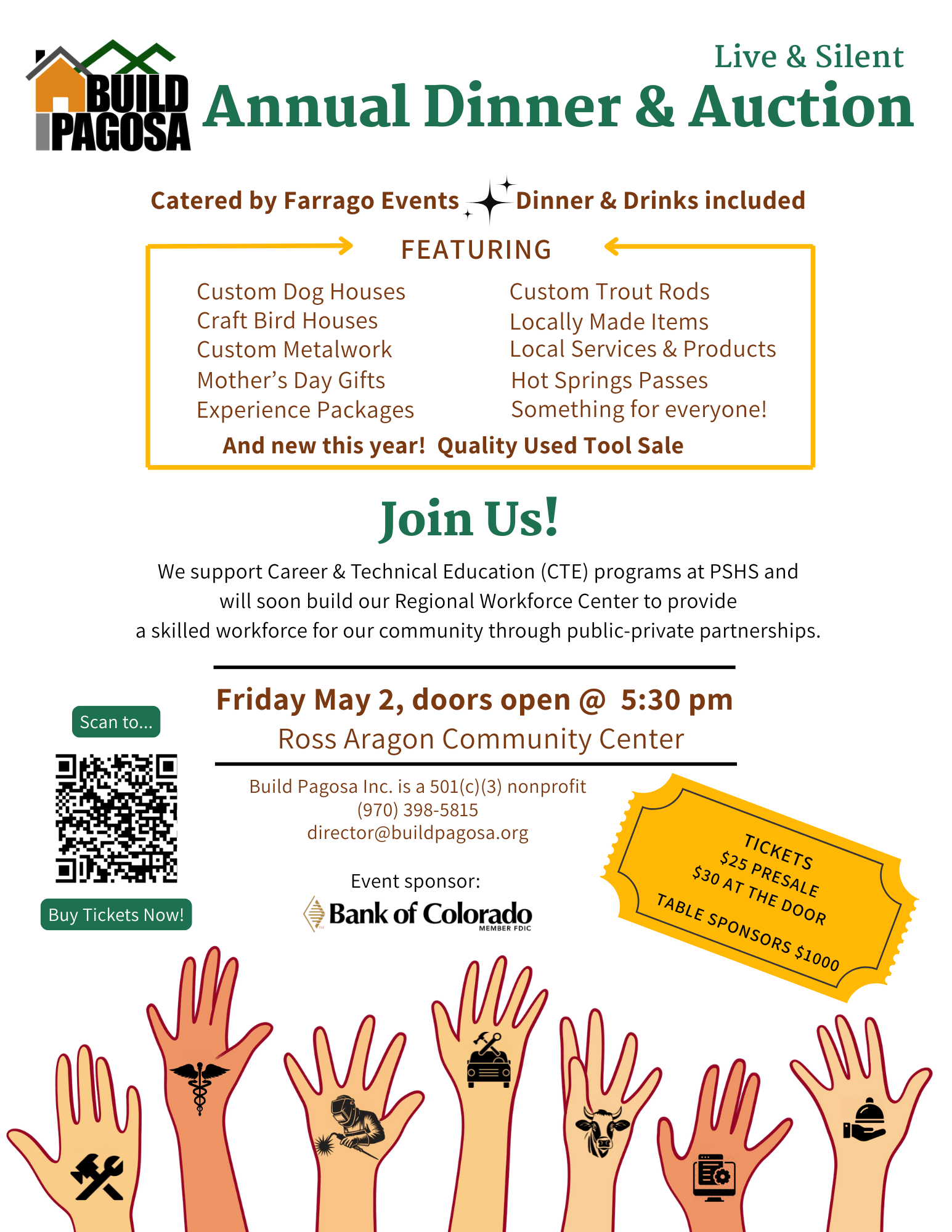 Live and silent auction with a full dinner and drinks included. We'll be showcasing CTE student made products, along with donated handcrafted items, retail products and services, and experience packages. And new this year...a quality used tool sale as part of the silent auction! Come shop for yourself or for Mother's Day! All proceeds benefit ongoing support for the PSHS CTE programs and the building of our new Regional Workforce Center. Let's build our local skilled workforce. Together we Build Pagosa!