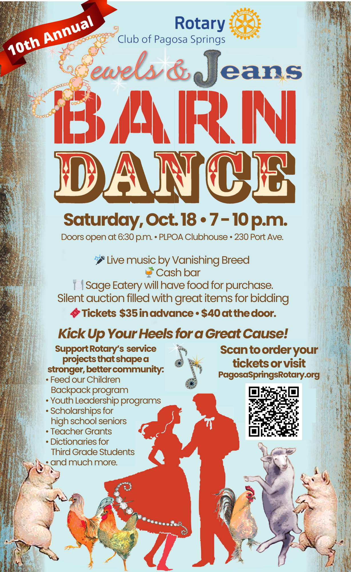 Tickets $35 in advance • $40 at the door. https://pagosaspringsrotary.org/events/10th-annual-jewels-jeans-barn-dance/