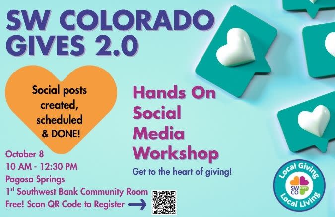 This workshop is dedicated to creating social media campaigns for Southwest Colorado Gives Day. By the end of the 2.5-hour session, attendees will have 5 social media posts scheduled from Early Giving on November 1 to Gives Day on December 9.