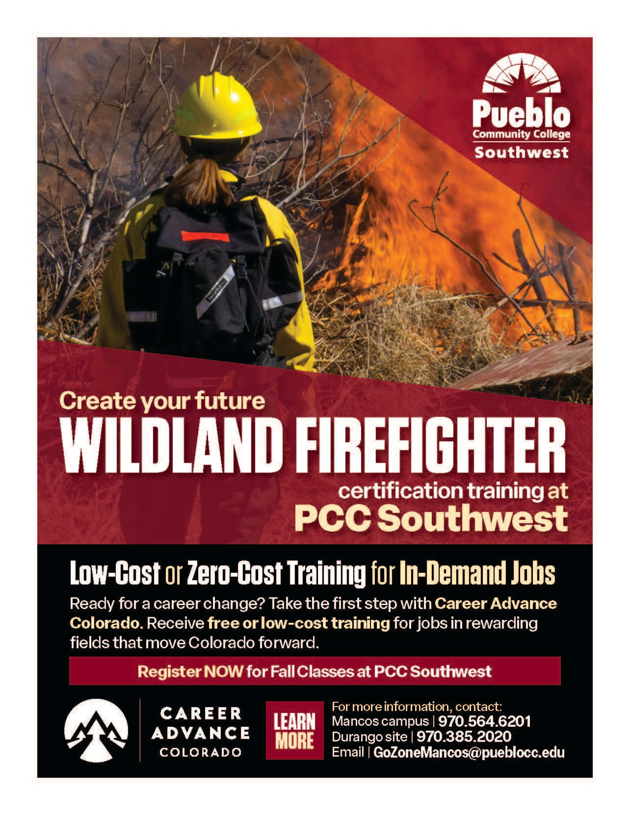WILDLAND FIREFIGHTER certification training at PCC Southwest Low-Cost or Zero-Cost Training for In-Demand Jobs Ready for a career change? Take the first step with Career Advance Colorado. Receive free or low-cost training for jobs in rewarding fields that move Colorado forward. Register NOW for Fall Classes at PCC Southwest LEARN MORE For more information, contact: Mancos campus | 970.564.6201 Durango site | 970.385.2020 Email | GoZoneMancos@pueblocc.edu